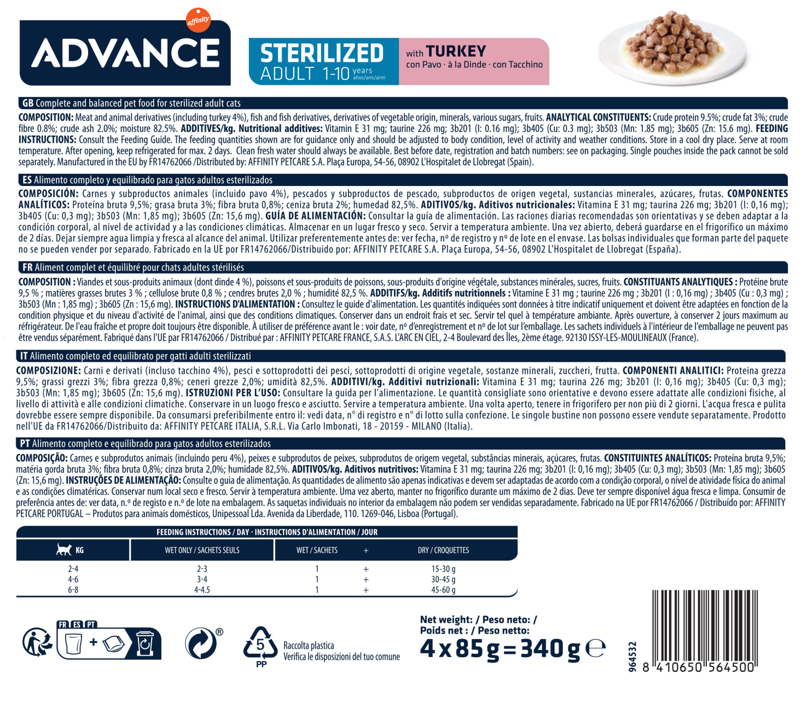 ADVANCE Adult cu Curcan este recomandată pisicilor adulte sterilizate cu vârsta între 1 și 10 ani.