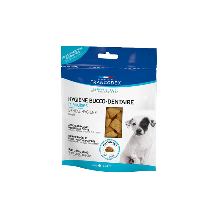 Formarea graduală a plăcii bacteriene dentare cauzează apariția tartrului pe dinții câinelui, respirația urât mirositoare și inflamarea gingiei, care poate fi dureroasă. Recompensele Dentare pentru cățeluși Francodex ajută la înlăturarea resturilor de mâncare și limitează acumularea de tartru datorită acțiunii abrazive a stratului exterior din cereale. Conțin ulei din semințe de pătrunjel și mentă pentru combaterea respirației urât mirositoare. Aportul de Vitamina C susține sănătatea gingiilor. Este esențial să-i asiguri cățelușului tău o curățare regulată a dinților de la o vârstă cât mai mică, pentru a preveni depunerea tartrului și a reduce problemele dentare viitoare.